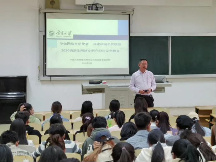 讲座过程中,宣讲人何老师首先提出重视网络信息安全的必要性,强调要遵守网规网纪,重视网络文明。接着何老师表示,网络不是法外之地,要正视自己的言行,提醒同学们要加强法律意识和自我保护意识,并多角度说明了应对方法和处理措施。