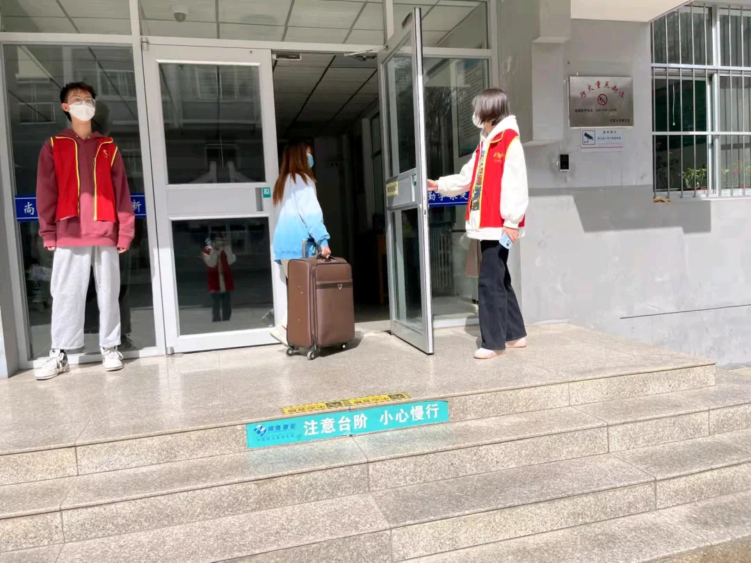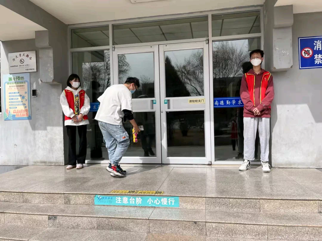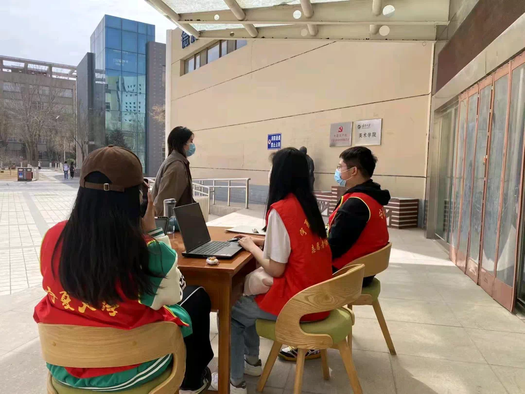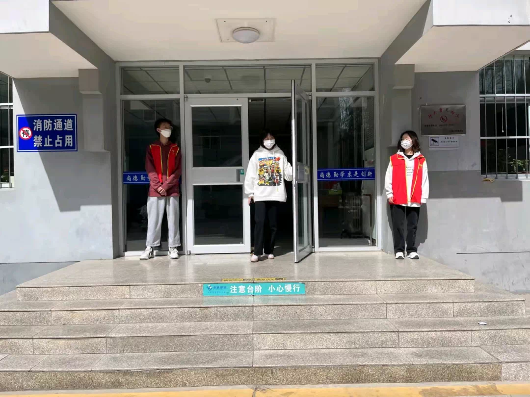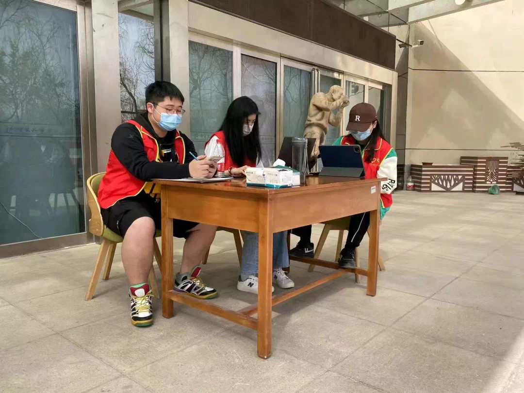 德雅楼楼前,志愿者们及时掌握同学需求,对进出人员做好登记、体温测量、查验健康码、信息收集、隔离、秩序引导等工作。同时,志愿者们还提醒同学们戴上口罩,注意社交距离,提醒进入人员用消毒液消毒等。