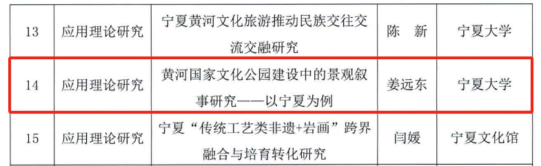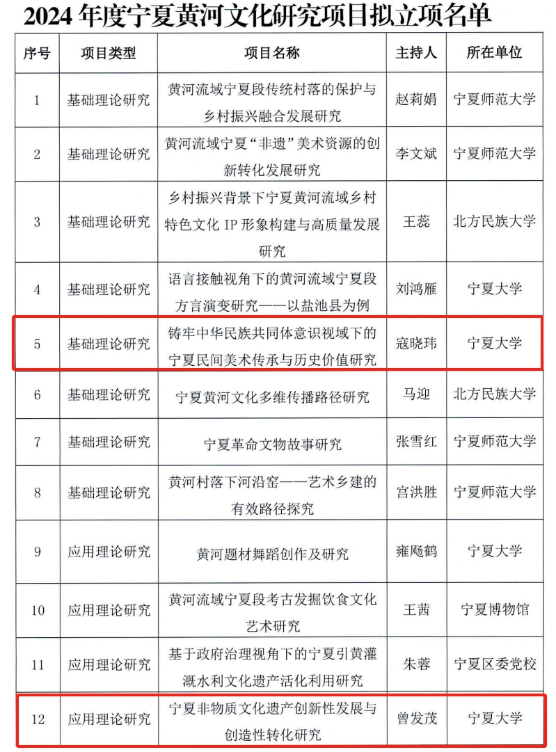 本次课题旨在推动宁夏黄河文化的传承与发展,推出一批具有影响力的宁夏黄河文化保护和高质量发展文化研究成果。懂球体育获批的项目分别是由寇晓玮老师主持的《铸牢中华民族共同体意识视域下的宁夏民间美术传承与历史价值研究》、曾发茂老师主持的《宁夏非物质文化遗产创新性发展与创造性转化研究》、姜远东老师主持的《黄河国家文化公园建设中的景观叙事研究——以宁夏为例》。