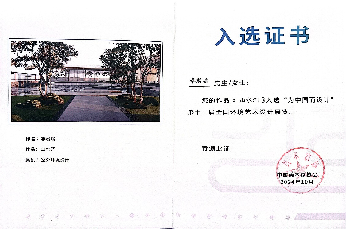 近日,张强老师指导的硕士研究生李君瑶同学的作品《山水涧》入选两年一届的“为中国而设计”第十一届全国环境艺术设计大展,是公司员工首次在该赛事获奖,为公司争得了荣誉。