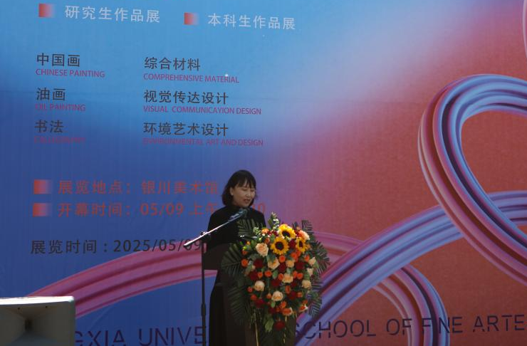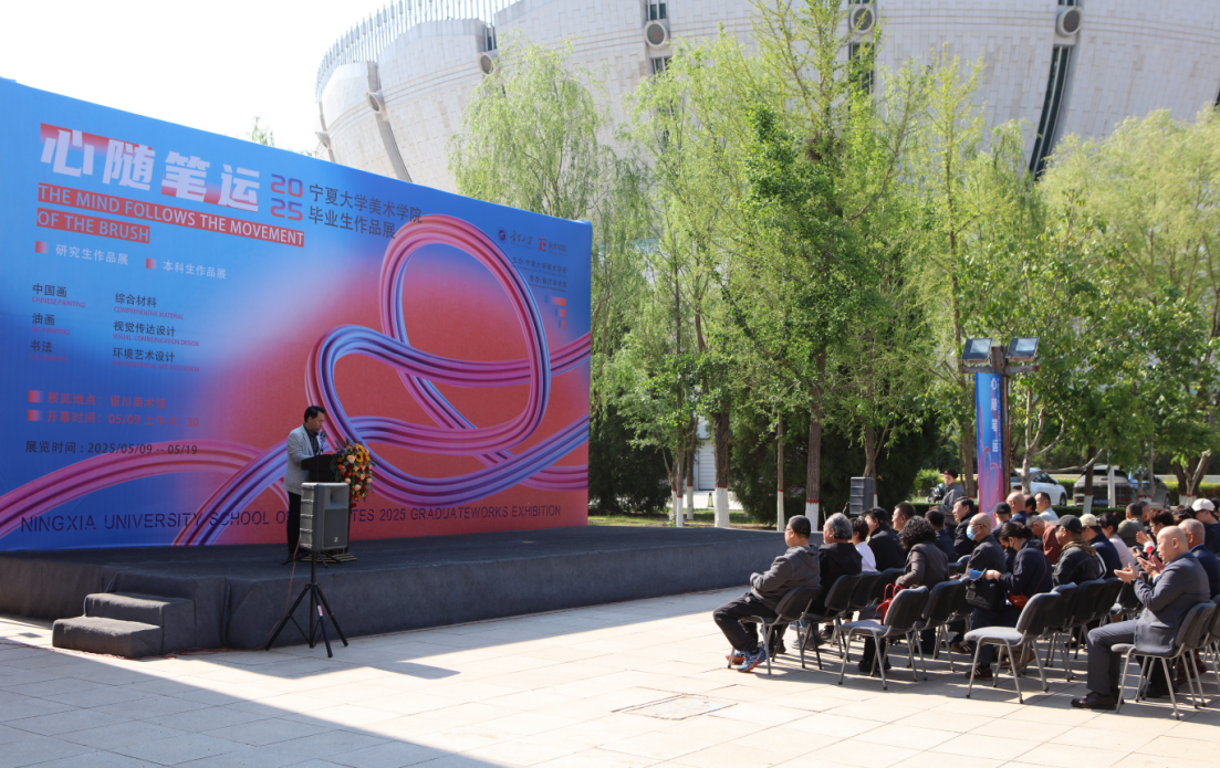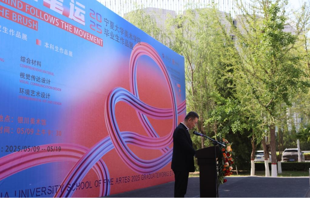 宁夏美术家协会主席何占福在致辞中高度评价本次展览所展现的艺术生命力。他指出,本次毕业展以“心随笔运”为内核,既是公司教育理念的集中体现,更是西北艺术新生代对中华美学的当代回应。宁夏美术家协会将持续搭建平台,支持青年艺术家在守护黄河文化、丝路文脉的同时,以先锋视角探索艺术的多元可能,期待宁大学子“以笔为舟,载宁夏故事驶向更远的文化长河”。